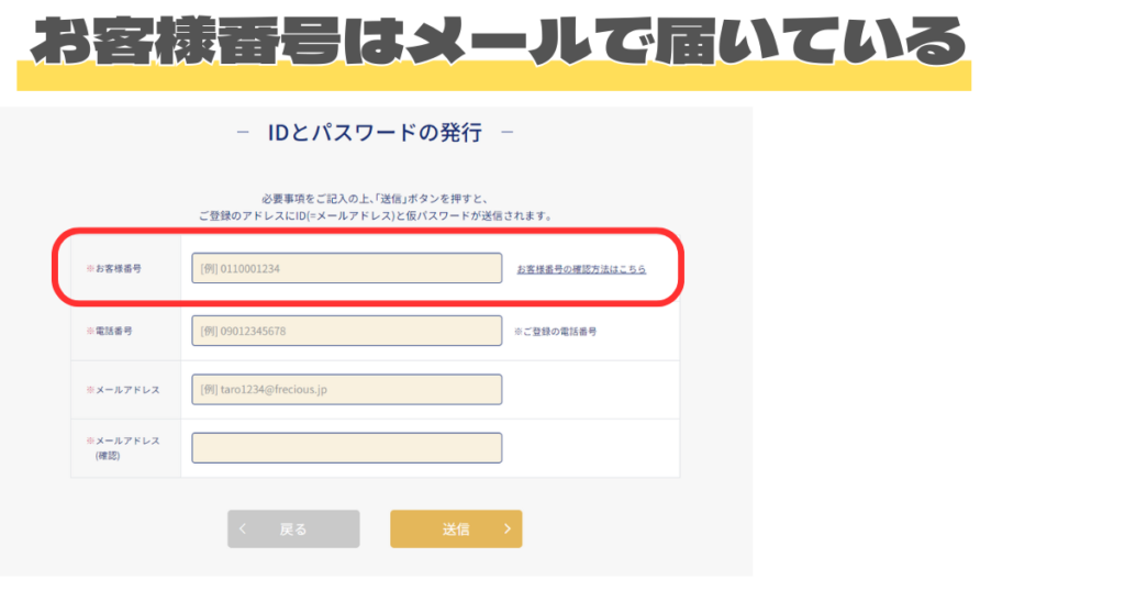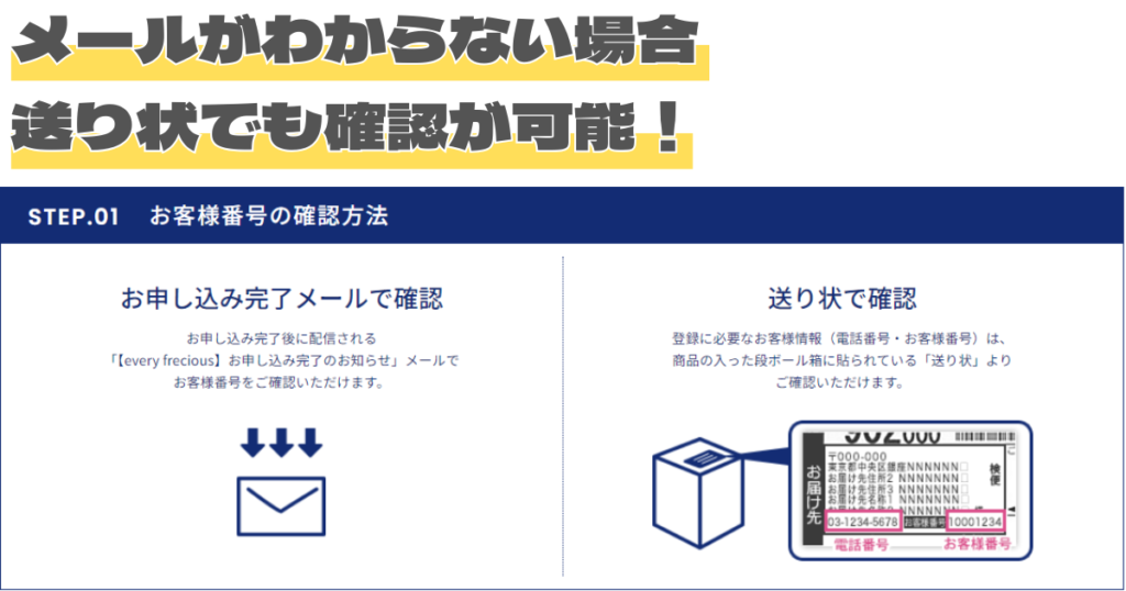 ・マイページのお客様番号は申込時のメールか送り状で確認が可能