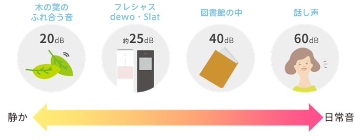 音の大きさ(騒音レベル)を測る単位をdb(デシベル)といいますが、フレシャスのデュオやスラットは25dbになります。